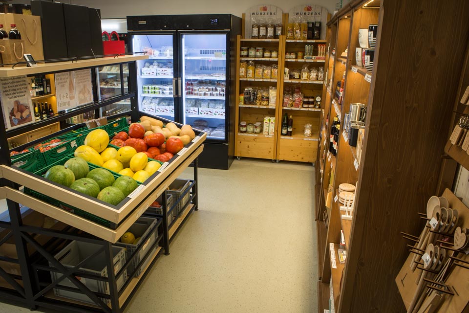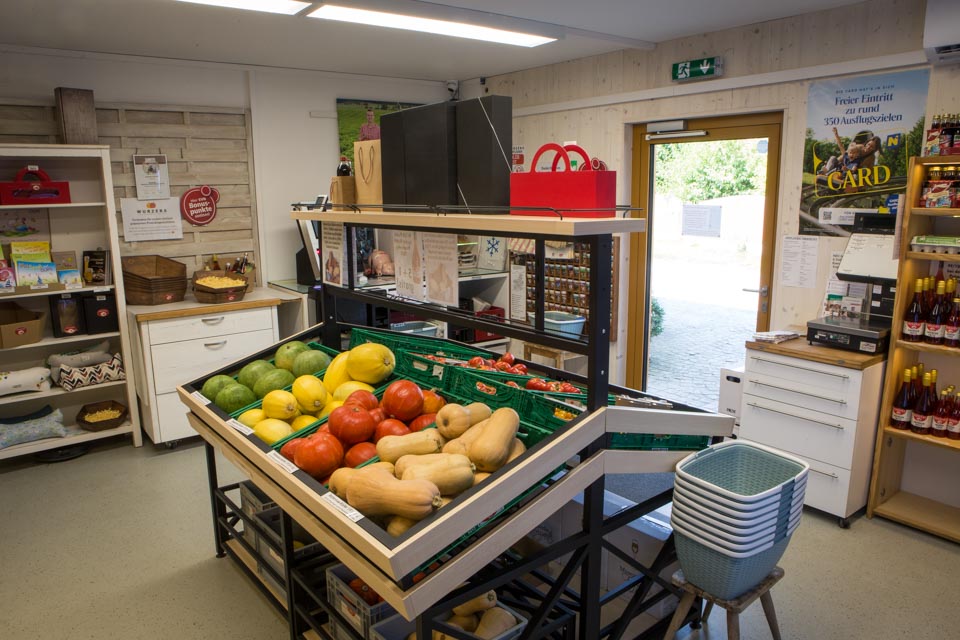 Selbstbedienungs-Hofladen mit 150 zusätzlichen regionalen Lebensmitteln ist täglich von 6-21 Uhr geöffnet. Mit gekühlten Getränken, Snacks, WCs und schattigen Sitzgelegenheiten ist er eine ideale